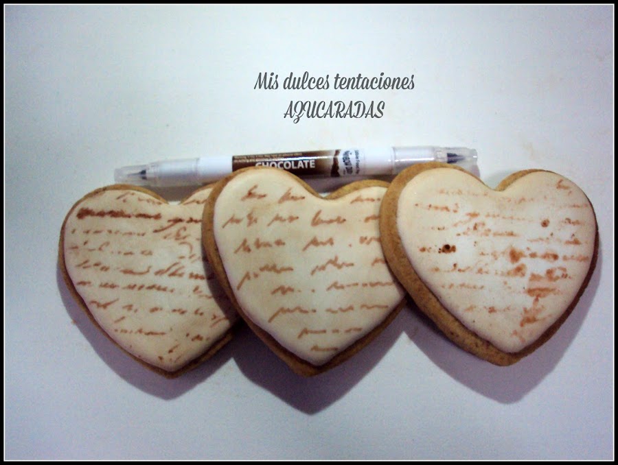 No importa que no consigas este tipo de stencil.Como verás ayudándote de un rotulador comestible de color marrón podrás escribir tú misma las letras procurando hacer garabatos inclinados y conseguirás el mismo efecto,tal como puedes ver en la galleta del medio.