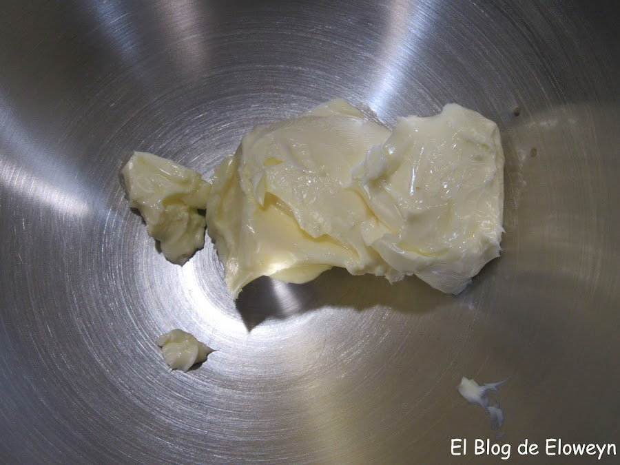 Primero de todo, y para nuestra propia seguridad, comenzaremos con la masa de las galletas. Ponemos la mantequilla en un bol lo suficientemente grande para que quepa toda la masa. La mantequilla debe estar a temperatura ambiente, por lo tanto, estará como se suele decir "en pomada". Esto quiere decir que estará blandita, como si fuese una pomada.