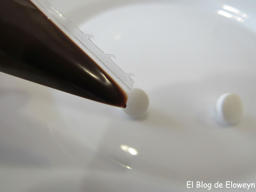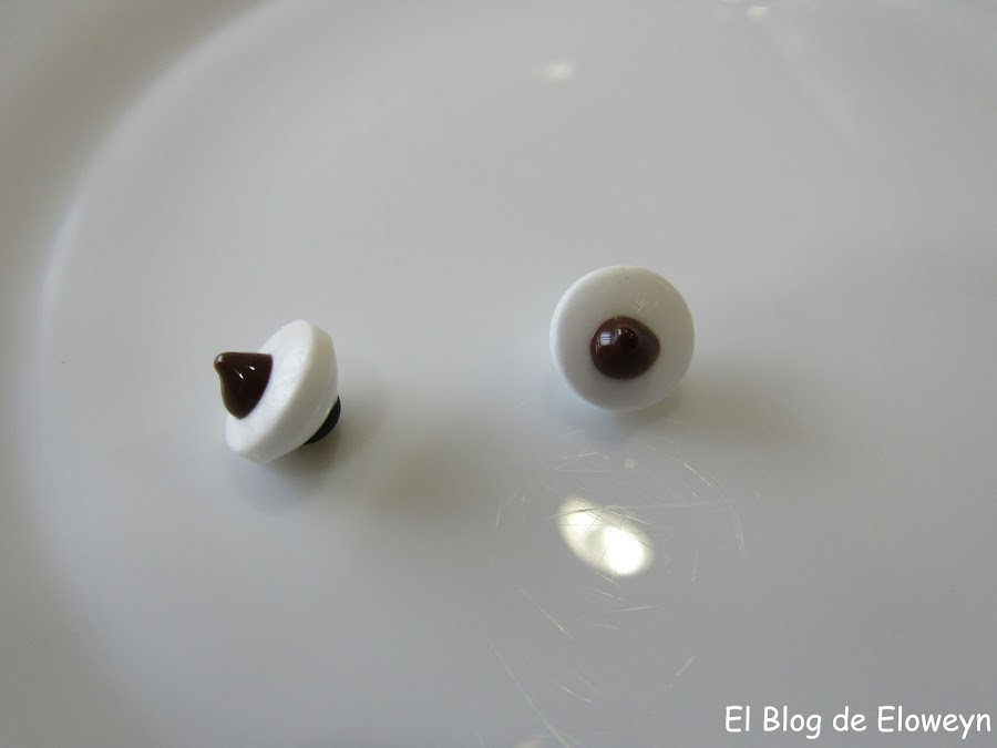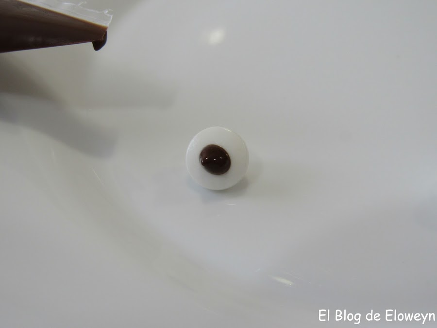 Ponemos una gotita de chocolate en la parte trasera del primer ojo.