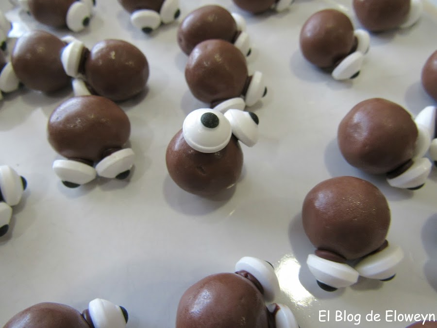A continuación, y esto es muy importante, sacamos UNA única bolita de chocolate del congelador y rápidamente pegamos los ojos uno por uno a la bolita por la parte donde le hemos puesto la gota de chocolate. Tenemos que tener mucho cuidado de no mancharnos los dedos, porque igual acabamos manchando el ojo. ¿Y por qué sacamos sólo una bolita y no todas? Pues porque de este modo, el resto de bolitas siguen congeladas y no se calientan. Con la bolita congelada, la gotita de chocolate que hemos puesto se pega instantáneamente, ya que el chocolate se solidifica al tocar la bola congelada. Si no estuviese congelada, el ojo no se pegaría instantáneamente y sería una guarrería, porque no pararía de caerse.