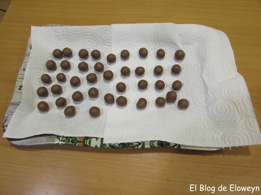 A continuación ponemos la mitad de las bolitas de chocolate en una bandeja forrada con papel. Tienen que estar separadas unas de otras. Estas bolitas serán las cabezas de las arañas. Tratadlas bien...