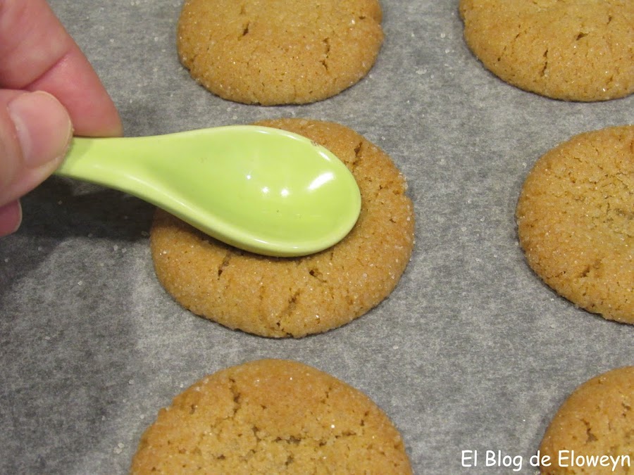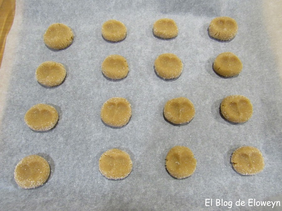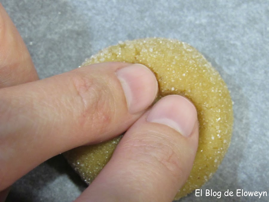 A continuación, chafaremos un poquito la bolita por el centro, con los dos pulgares, para que quede aplanada. La siguiente foto la hice con unas galletas de prueba que eran más grandes que las nuestras. La pongo para que veáis más o menos cómo chafarlas.