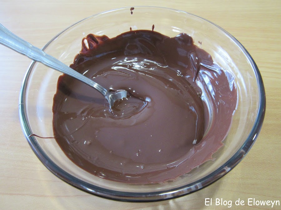 A continuación, una vez fundido, ponemos el chocolate en una manga pastelera desechable. Si no tenéis, podéis usar una bolsa de estas que se usan para congelar los alimentos. Esperamos unos 5 minutos para que se temple un poco el chocolate y que no esté tan líquido.