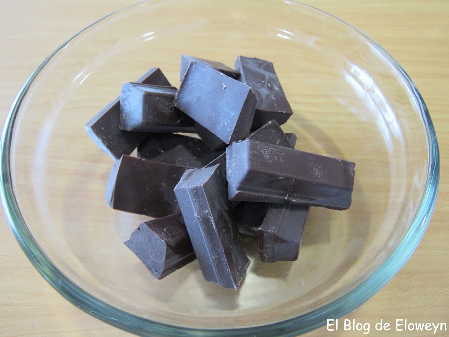 A continuación, seguimos con las arañas... Partimos el chocolate para fundir en trozos y lo ponemos en un recipiente apto para microondas.