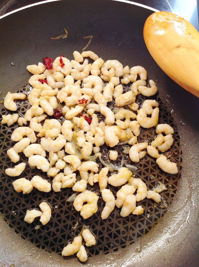 A continuación, echamos las gambas peladas y cortadas en trocitos. Volvemos a saltear un poco hasta que se hagan, no mucho para que no queden muy secas. Salpimentamos y reservamos.