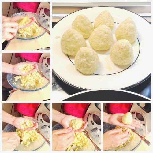 Sobre la palma de la mano, formamos una capa delgada de arroz, con una cuchara le añadimos una cantidad moderada de relleno, dos o tres dados de mozzarella y cerramos con otra capa de arroz.