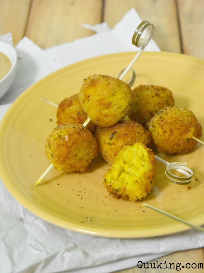 Los arancini son unas bolas de arroz con azafrán (de ahí su nombre ya que la palabra arancini significa naranjita) que suelen rellenarse con carne boloñesa, queso, verduras etc, como si se tratase de pasta. En mi caso para hacerlas más sencillas simplemente les añadí bastante queso parmesano y la verdad es que mi "invento" funciono perfectamente. Eso si, prometo que otro día que tenga más tiempo os traeré unos auténticos arancini rellenos. De momento os dejo con estos para abrir boca...