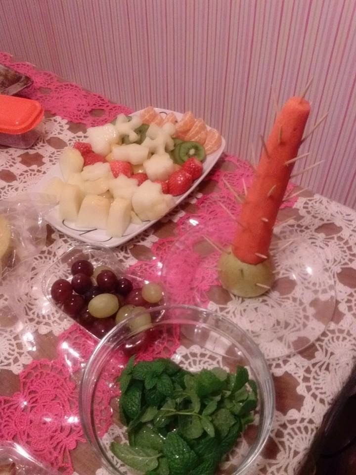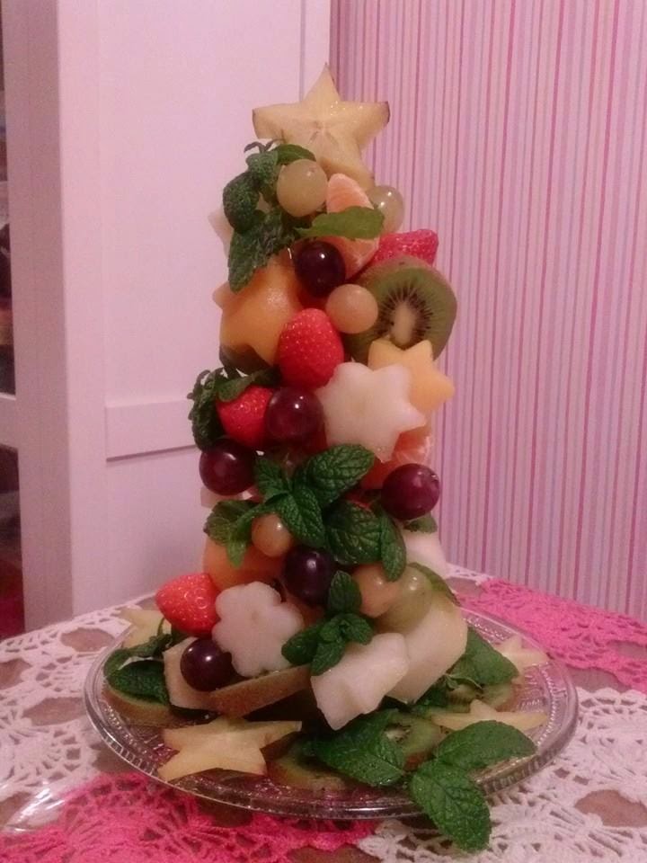 Y las frutas las que más os gusten. Las estrellas se hacen con carambola, aunque con el cortapastas hemos hecho de melón y mango también. Los huecos se rellenan con menta, que le da frescura y el toque de color. Os recomiendo empezar por abajo e ir subiendo.