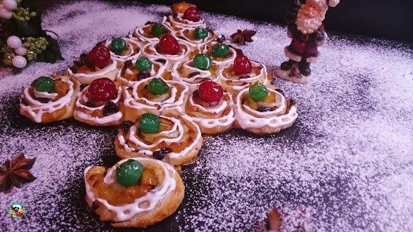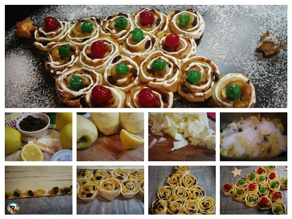 Si eres de esas personas, si eres tan especial. Para ti tengo este original árbol de navidad. Un árbol hecho con caracolas de hojaldre rellenas de manzanas y pasas. Muy parecido al pastel strudel alemán de manzanas. Este pastel es toda una delicia para la vista y el paladar.Árbol de navidad de caracolas