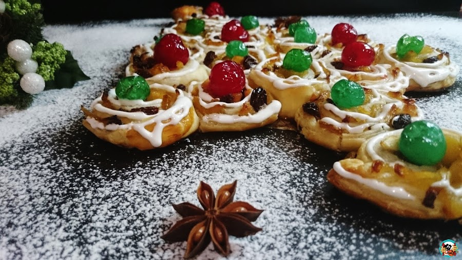 3.- Cubrimos una placa con papel sulfurizado (papel de horno). Ponemos las caracolas de hojaldre sobre el papel formando un árbol de navidad. Pincelamos con un huevo batido. Ponemos en el centro de cada caracola una guinda verde y una roja, alternando los colores. Precalentamos el horno a 180ºC y cocinamos el pastel 35 o 40 minutos, hasta que el hojaldre este dorado. Retiramos el pastel del horno, lo dejamos enfriar y decoramos con la glasa blanca. (Ver receta).