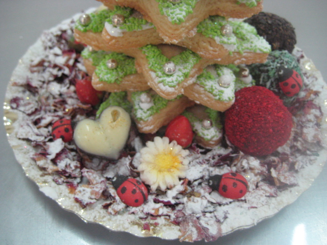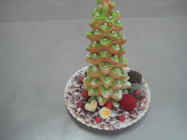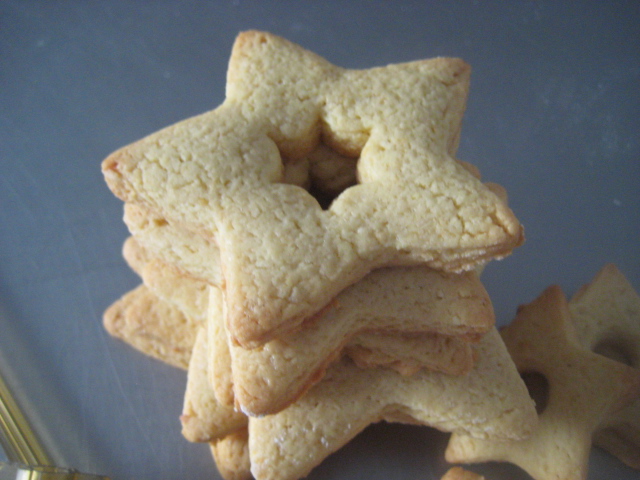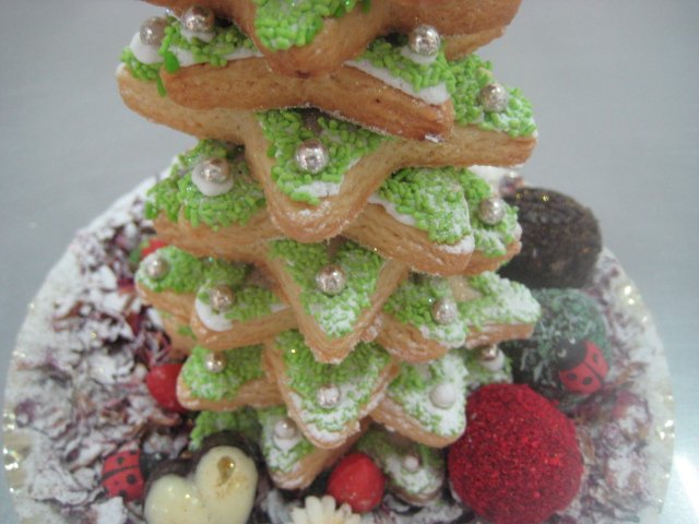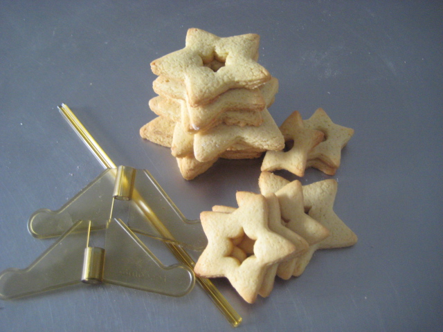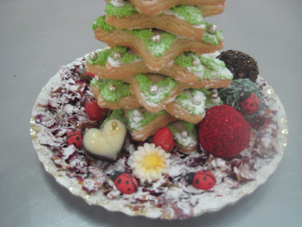 Preparación: En un bol poner la mantequilla a temperatura ambiente y trabajarla con el azúcar. Cuando esté cremosa añadir los huevos de uno en uno, de forma que hasta que no esté bien incorporado el primero no se agrega el siguiente. Una vez añadidos los huevos agregar la mezcla de 4 especias (canela, clavo, nuez moscada, jengibre) y por último la harina mezclada con el impulsor o levadura química. Trabajar de nuevo la masa y cuando esté bien compacta se divide en dos y se pone entre dos papeles de horno. Estirar con un rodillo graduable a un grosor que puede ir desde 6 mm a 1 cm. Una vez laminadas dejar en la nevera un par de horas o hasta el día siguiente. Entonces cortar con cortapastas en forma de estrellas, haciendo de diferentes tamaños para formar el arbol. Yo he puesto 14 estrellas yclaro e hecho varios. Salen tres árboles . Colocar en bandejas de horno forradas con papel y cocer a 180-190º entre 8 y 10 minutos según el horno y grosor de las galletas. Dejar luego enfriar sobre rejilla. Una vez frías, aplicarles glasa de albúmina y diferentes decoraciones, a nuestro gusto, siempre en el borde de las estrellas que es lo que se va a ver. Dejar que se sequen por completo. Un vez bien secas las galletas de forma que nos haya quedado la decoración bien adherida, montar el árbol, pegando las estrellas entre sí con glasa. Volver a dejar secar y luego montarlo sobre un soporte y ponerle alguna decoración. Yo las había hecho primero con agujero para montarlas en un soporte que compré, pero no me ha servido de nada porque queda mucho mejor sin soporte, por lo que entonces no es preciso hacerle un agujero central a las estrellas. Otro utensilio inútil...