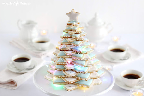 Por último os quiero escribir sobre las luces que he usado para decorar, las venden en tiendas de decoración o en cualquier sitio donde vendan decoración navideña, están pensadas para decorar centros de mesas, no son demasiado largas de 30 a 50 cm y funcionan a pilas, por lo que son perfectas para decorar pequeños centros o nuestro arbolito de Navidad, el dispositivo de las pilas es pequeño y podemos camuflarlo entre la decoración. Elegí las luces de colores porque aportan alegría y hacen destacar más el árbol sobre el stand de tartas blanco, se me ocurrió en el último momento, las luces las compré para dar un aspecto más de Navidad a mis vídeo y pensé que quedaría muy bien en el árbol ¿os gustan? además es una forma de hacer algo diferente a todas la publicaciones que hay por Internet sobre árboles de galletas.