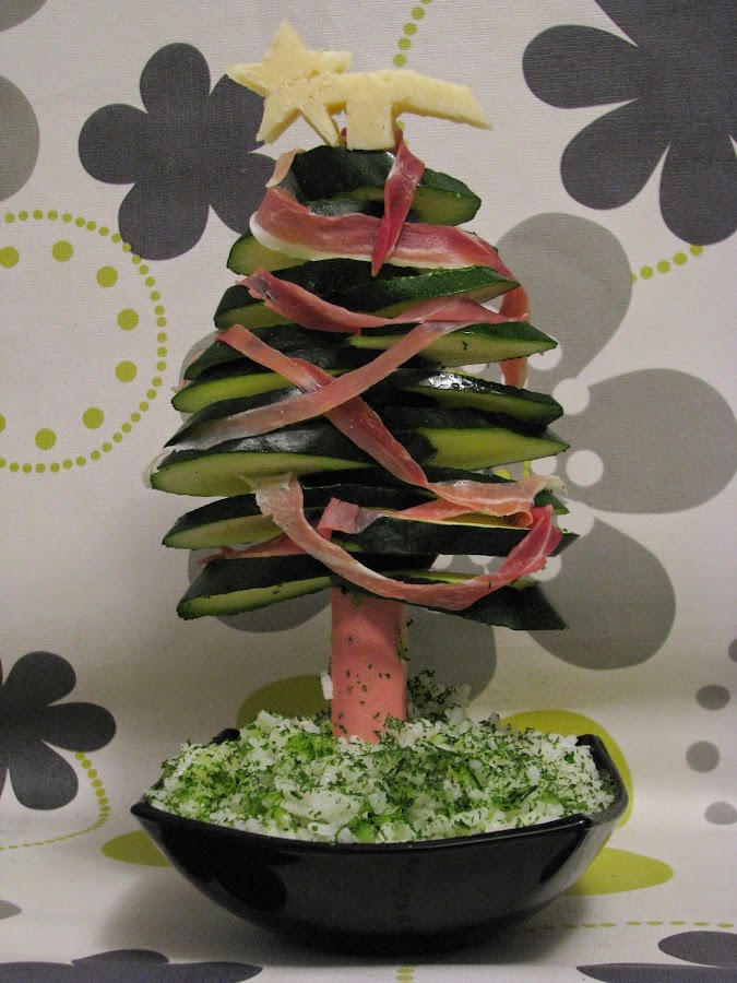 - Corta la loncha de jamón serrano a lo largo en tiras finas y colócalas sobre el calabacín como si fueran guirnaldas.