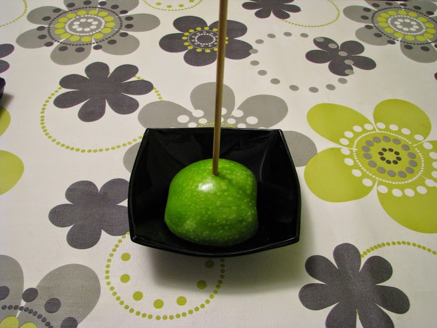 - Clava sobre el centro de la manzana un palo de madera (como los que se utilizan para hacer brochetas).