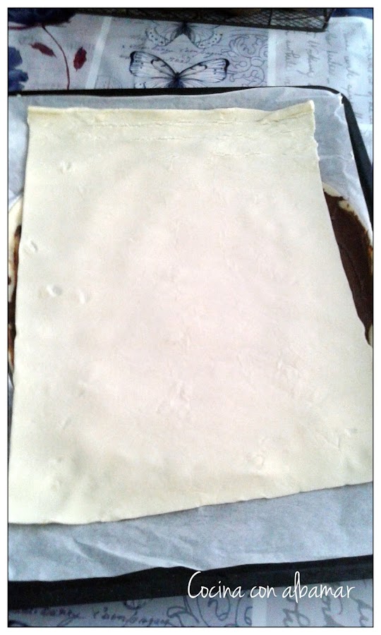 Poner la otra masa de hojaldre, ya estirada sobre la Nutella.