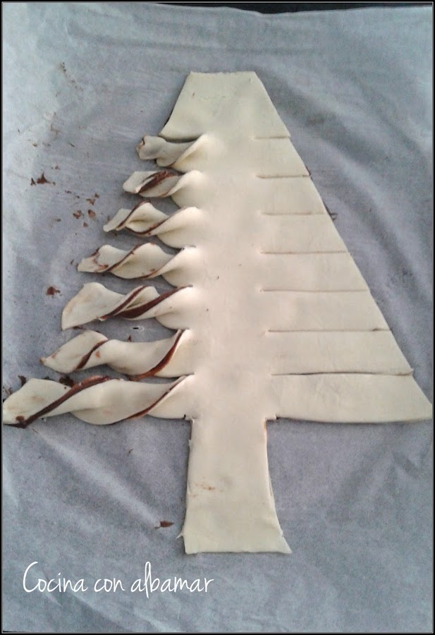 Estirar la masa de hojaldre sobre papel de hornear y ya puesto en la bandeja que vayamos a introducir en el horno (después sería difícil manejar el árbol)