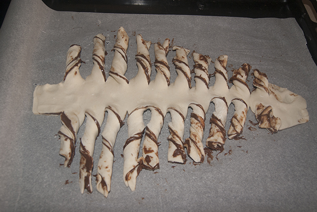 Calentamos la nutella en el microondas durante un minuto, para que podamos manejarla mejor. Con una paleta de cocina extendemos una capa fina de nutella por toda la superficie del hojaldre, colocamos la segunda lámina encima y con un cuchillo de punta vamos haciendo la forma de un árbol y recortando las partes que sobran (con esas partes y unos moldes de galletas de navidad podemos hacer también unas estrellas o campanas para acompañar al árbol). Haz los cortes de las ramas y llévalo al frigo 15 minutos. Esto lo hacemos para que se enfríe un poco la masa y la nutella.