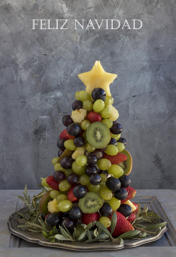 La receta o no receta de hoy más que nada es una excusa para venir a felicitaros la Navidad. Una propuesta fácil (aunque algo laboriosa) para que vuestros niños os ayuden con uno de los posibles postres para esta Nochebuena. Podéis poner la fruta que más os guste pero que sea fácil de pinchar o de cortar.