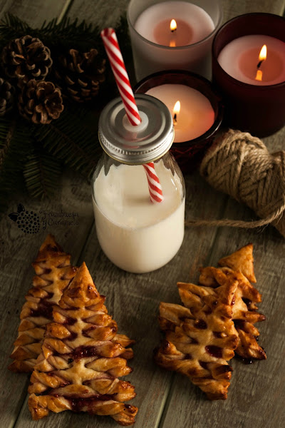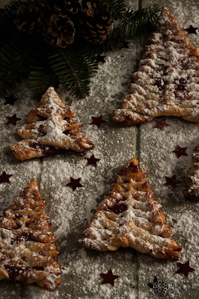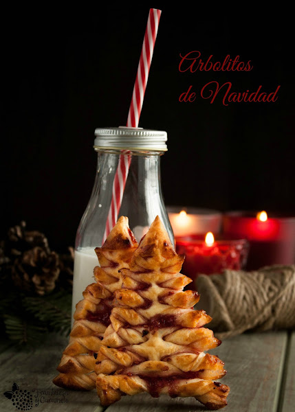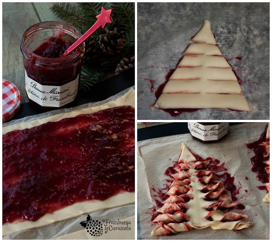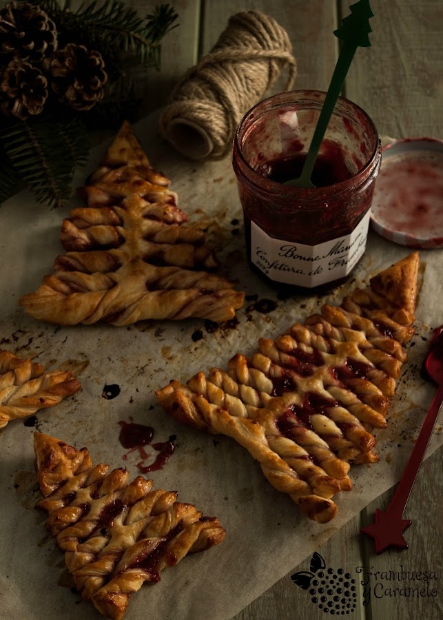 Son unos simpáticos y tiernos arbolitos de Navidad hechos con hojaldre y mermelada. La receta la encontré curioseando Pinterest (¡podéis seguirme que me hará mucha ilusión!!), allí lo hacían de un tamaño enooorme casi tamaño original y con Nutella… Así que se me ocurrió hacer un tamaño más pequeñito y coqueto con mermelada de frambuesa, ¡¡que como tiene ese color rosado tan bonito pues han quedado preciosos!! Al final ya nos vinimos arriba y espolvoreamos azúcar glass que la verdad les dio un toque invernal y navideño muy bonito.