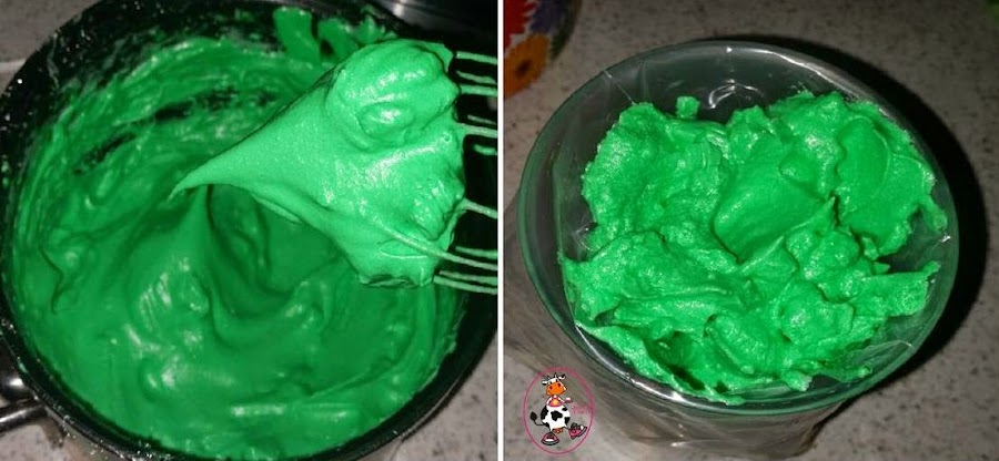Mientras, ponemos las claras de huevo en un bol y batimos con unas varillas eléctricas hasta que esté a punto de nieve. Añadimos el colorante en gel y batimos hasta que tengamos el color deseado.