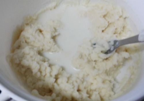 Puedes calentar un poco el agua para que la mezcla de ingredientes sea más fácil y se puedan compactar más. Agrega los quesos y la mantequilla.