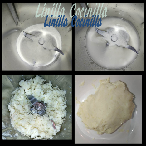 5. Divida la masa en 4 partes iguales y con las manos, de forma de bola, coloque un plástico transparente y encima coloque la bola y tape con la bolsa, aplaste ligeramente con un rodillo y forme círculos.