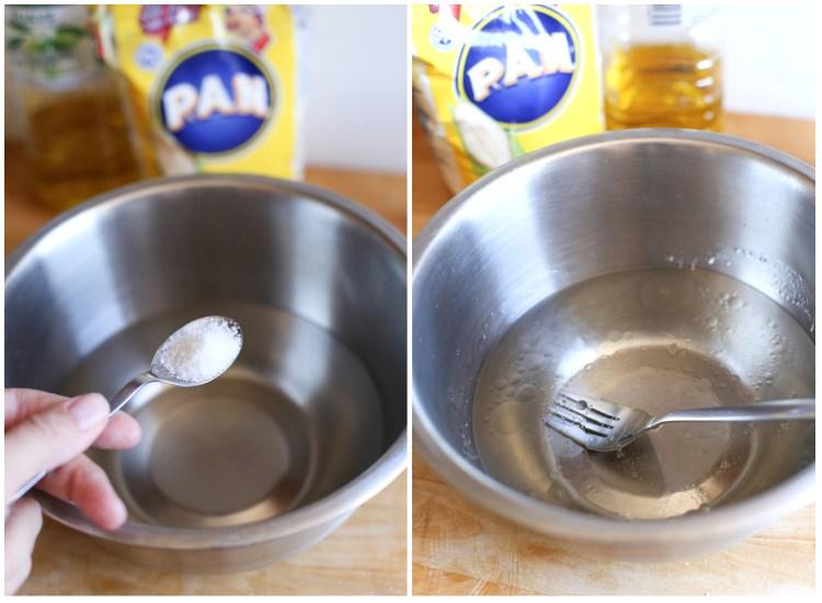 En un recipiente grande y hondo colocar 2 tazas y media de agua a temperatura ambiente, agregar 1 cdta de sal y 2 cucharadas de aceite. Revolver bien con la ayuda de un tenedor o cuchara.