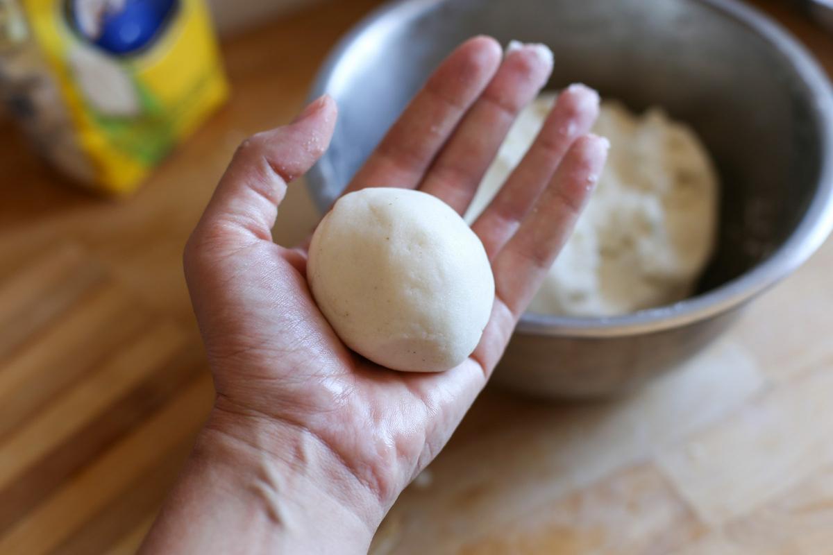Poner un poco de aceite o agua en las manos (para que la masa no se pegue al manejarla) y formar pequeñas bolitas del tamaño de la palma de la mano. Darles forma con la ayuda de la palma de la mano. Cuidar de que queden de un grosor tal de que luego se puedan cortar a la mitad sin problema,