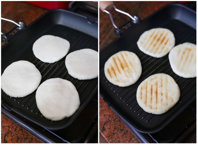 En un sartén grande (ideal tipo grill) esparcir un poquito de aceite y colocar las arepas. Cocinar a fuego medio aprox 12 minutos por cada lado (o hasta que estén doradas).