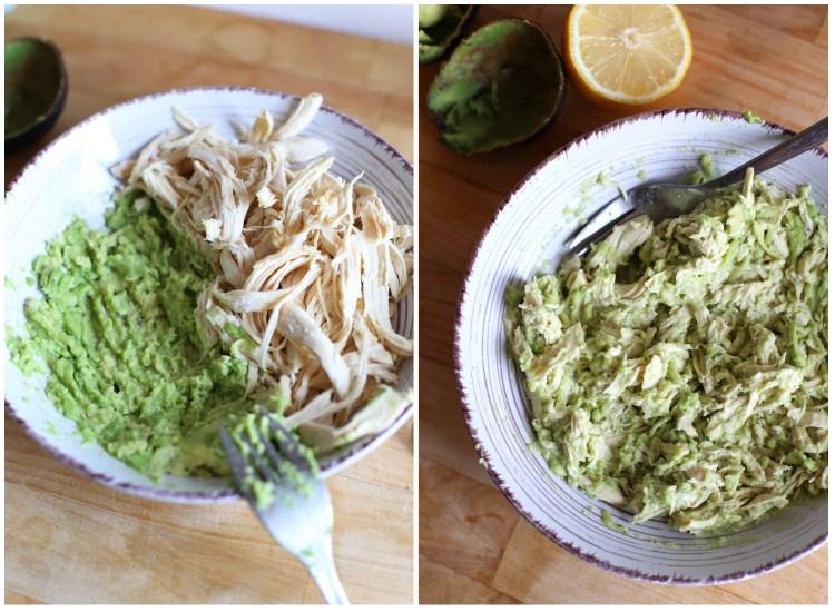 En un recipiente moler la palta con la ayuda de un tenedor, agregar el pollo desmenuzado, el jugo de 1/2 limón, 1 cucharada de aceite de oliva, 1 cucharada de mayonesa, y una pizca de sal y pimienta. Revolver todo muy bien. Añadir opcionalmente un puñado de cilantro picado muy fino a la mezcla.
