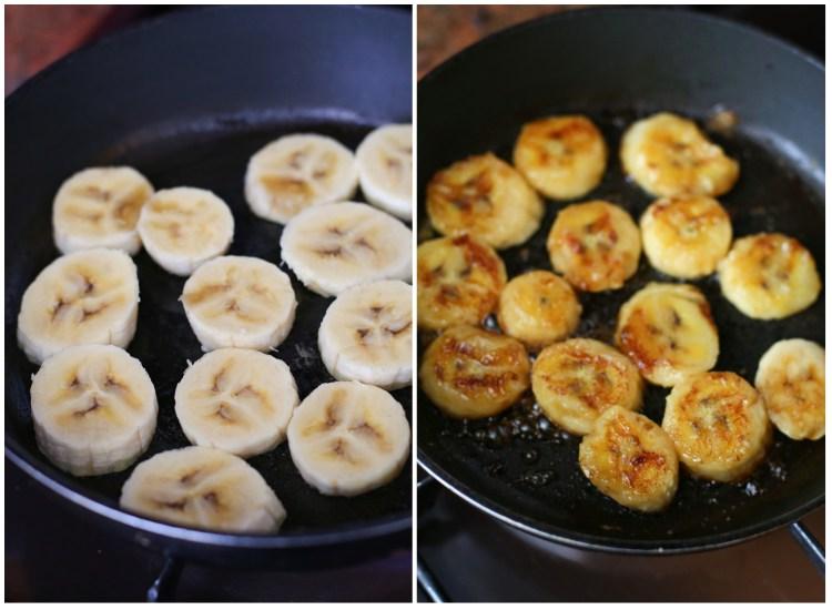 Para los plátanos dulces: Cortar en gajos el plátano. Calentar un sartén con un chorrito de aceite y colocar las rodajas. Esparcir 1 cucharada de azúcar morena sobre los plátanos. Calentar 1 minuto por lado y retirar. El azúcar sirve para caramelizar los gajos de plátanos.