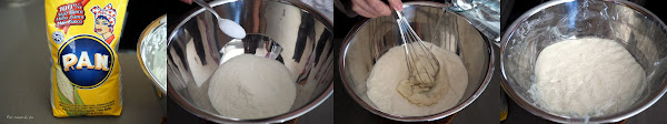 Colocar en un bol la harina de maíz, y añadirle la sal y la mayor parte del agua, conviene reservar un poco e incorporarla según la mezcla la necesite. Mezclar bien hasta que se forme una masa. Cubrirla con papel film y dejarla reposar unos minutos para que absorba bien el agua.