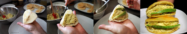 Abrir la arepa como si fuera una bolsa y rellenarla, con generosidad, con esta mezcla de pollo aderezado . Cortar el resto del aguacate en finas lonchas y colocar dos o tres en cada arepa. Lista para degustar!