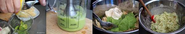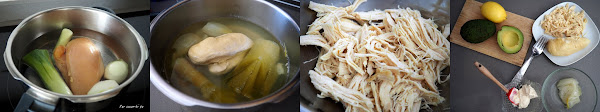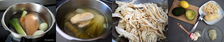 En el vaso de la batidora colocar el puerro y la cebolla, medio aguacate pelado y el zumo del limón, y triturar hasta que se integren bien los ingredientes. Verter en un bol sobre la carne de pollo, añadir la mayonesa y salpimentar al gusto. Mezclar bien hasta obtener una pasta homogénea.