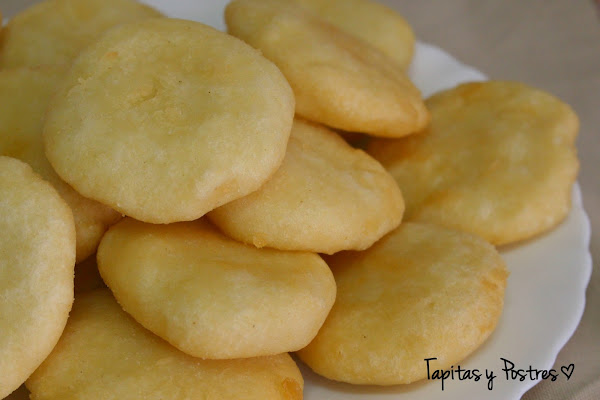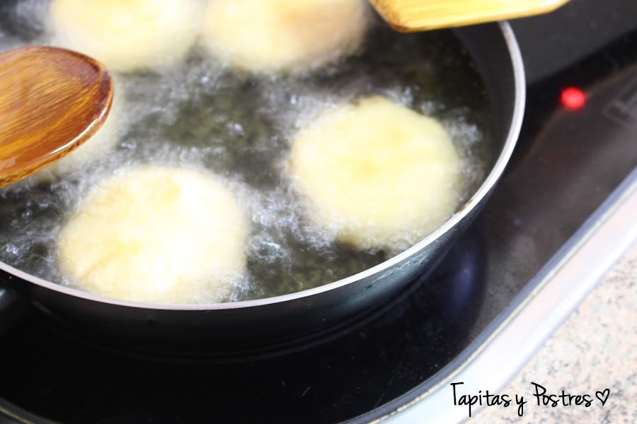 Cogemos porciones de masa y hacemos una bola, aplanamos y dejamos reposar unos minutos mientras se calienta el aceite. Freimos hasta que estén doradas.