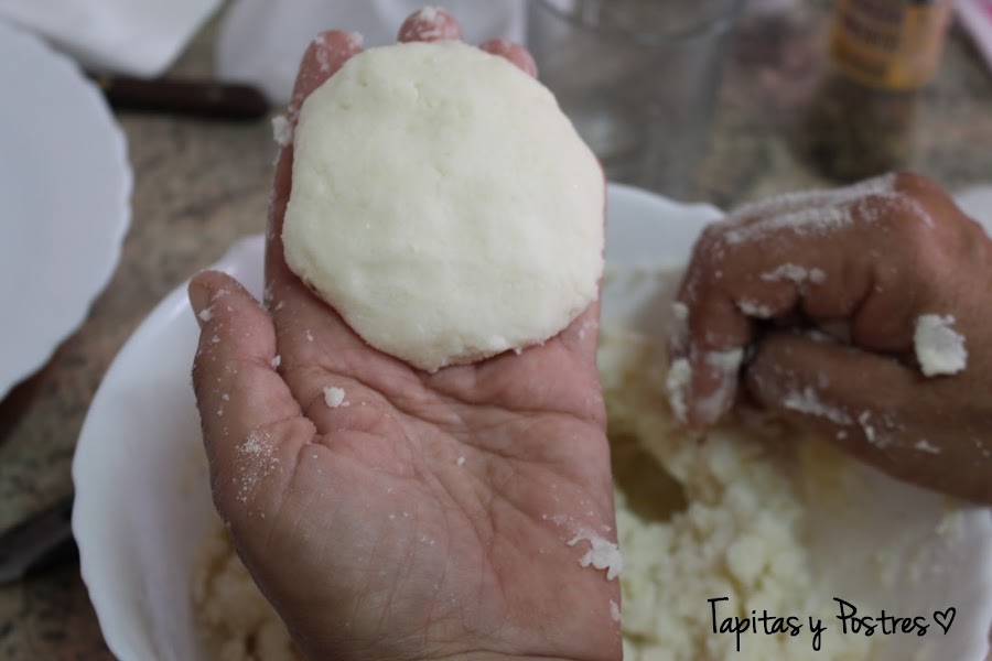 Cuando la masa esté lista, cogemos porciones y hacemos una bola, aplastamos hasta que nos quede del tamaño de media mano, aproximadamente.