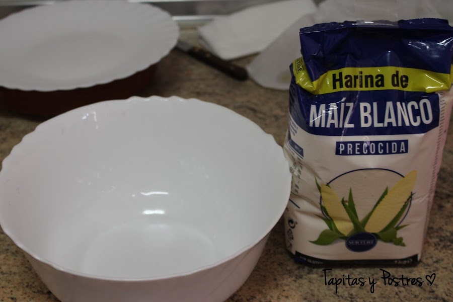 Ponemos la harina de maiz en un bol amplio con la sal y vamos añadiendo agua tibia (no toda) y mezclando hasta que obtengamos una masa elástica, lisa y manejable.