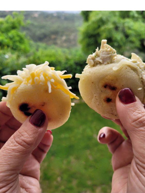 Ya una vez listas, las abres por la mitad y las rellenas con la preparación del pollo o del queso rallado.