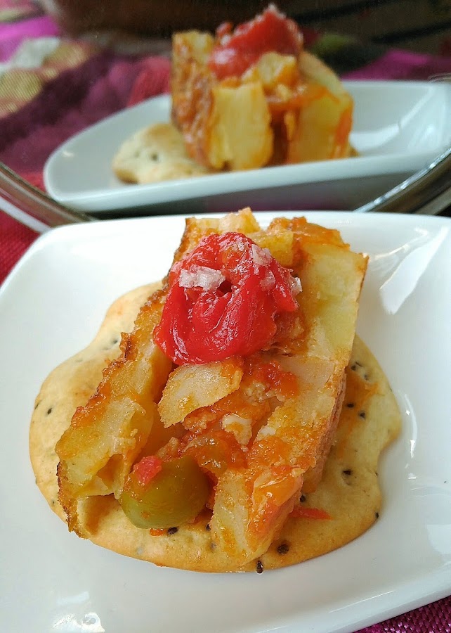 -Tortilla de patatas rellena de pisto y aceitunas de gran calidad con toque de pimiento asado y sal de cítricos sobre Marinera con semilla de chía.