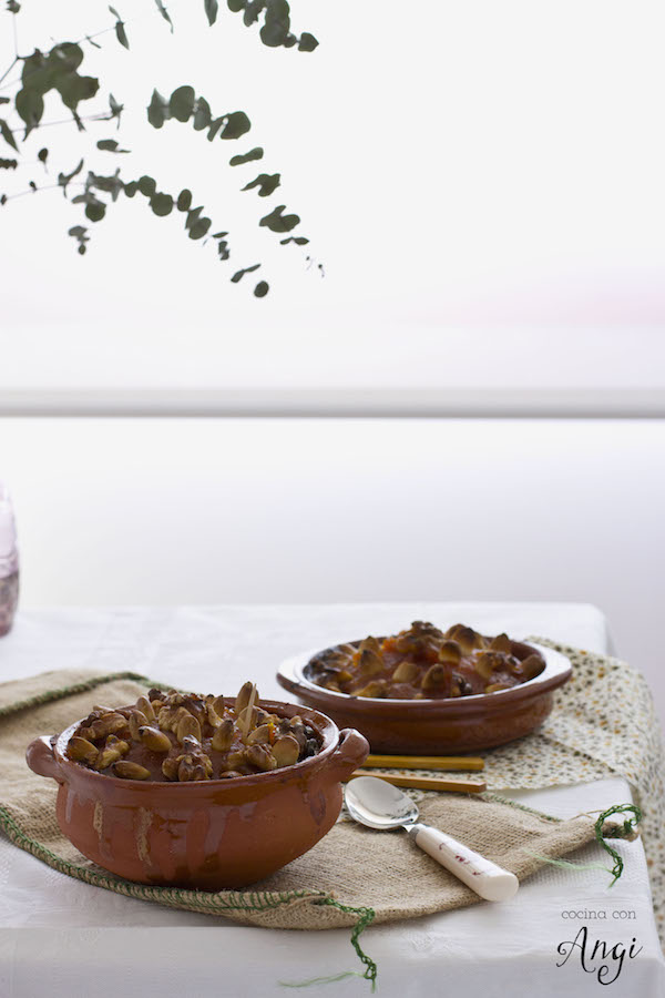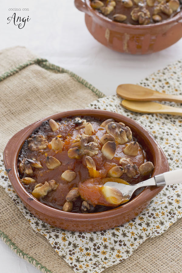Repartimos entonces en cazuelas de barro y decoramos con las nueces y las almendras.