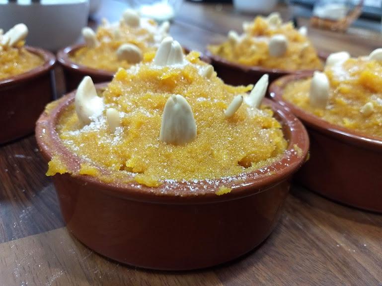 Se mezcla la pulpa con el azúcar y las yemas de huevo batidas. La masa se cuece durante 15 o 20 minutos al fuego, removiendo continuamente. Se añade a la masa las almendras molidas, la ralladura de limón y la canela.