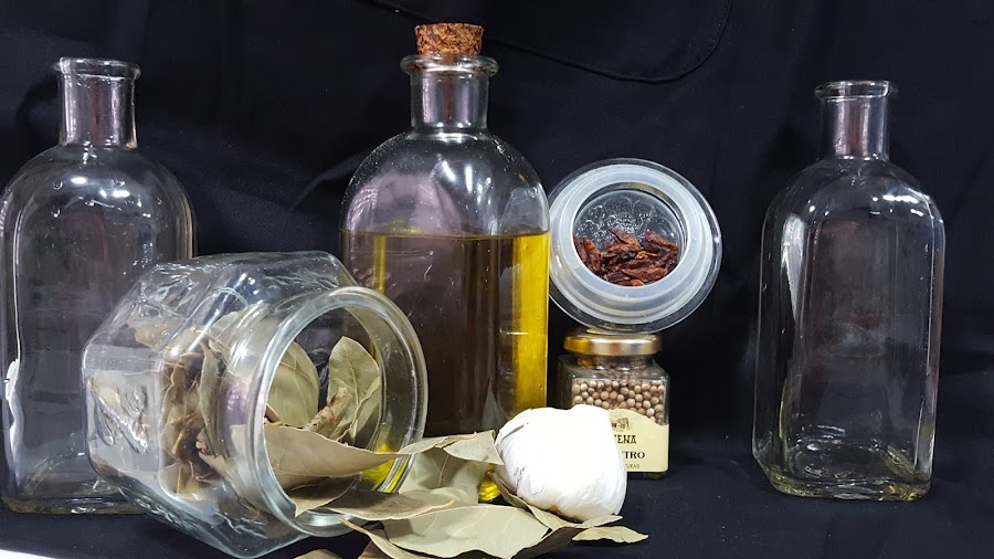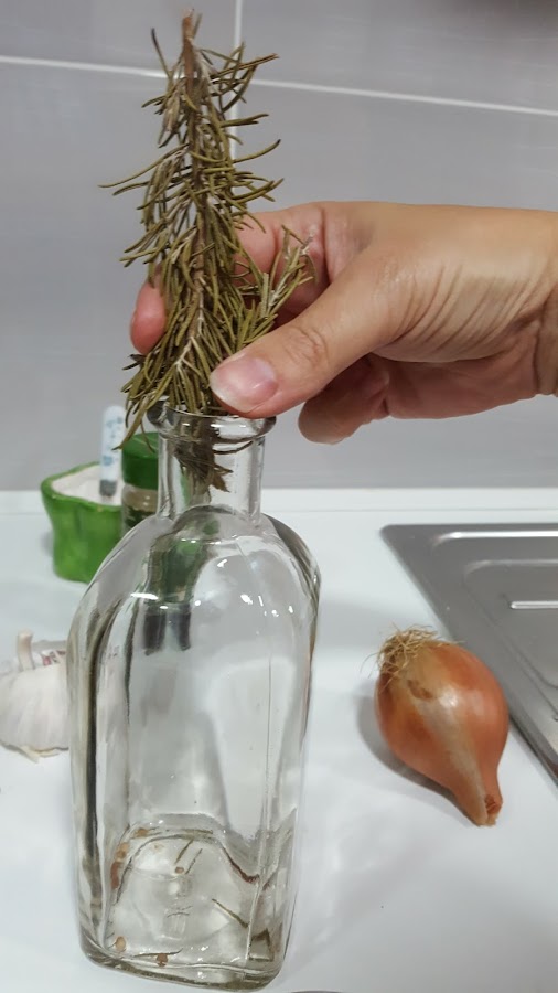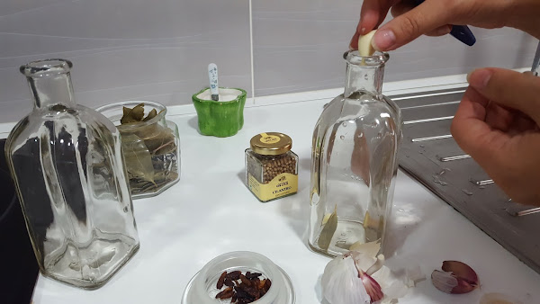 1.- Preparamos una botella de cristal. 2.- Pelamos los 5 dientes de ajo, los cortamos por la mitad y los vamos poniendo dentro de la botella. 3.- Añadimos los granos de pimienta, la guindilla y el laurel. Dependiendo de lo picante que os guste le añadís más o menos cantidad.