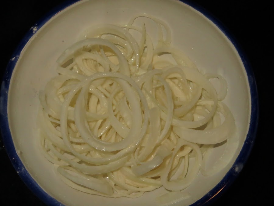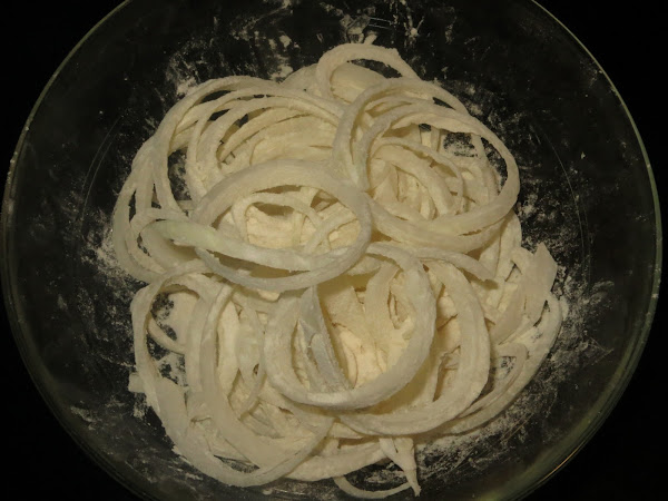 Lo primero que hacemos es pelar y cortar la cebolla en aros finos, ya que es una de las características de los aros de este restaurante. Luego se pasan por harina de trigo a la que habremos añadido sal y pimienta. A continuación, se bañan en leche, se escurren y se vuelven a pasar por harina.
