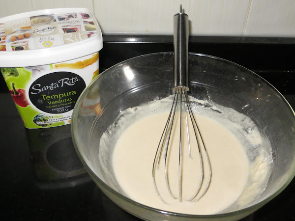 Luego comenzamos con la tempura, es muy sencillo si tenéis harina especial como es mi caso, lo único que debéis hacer es poner en un bol la harina e irle echando el agua fría mientras vamos batiendo, estará lista cuando no tenga grumos.