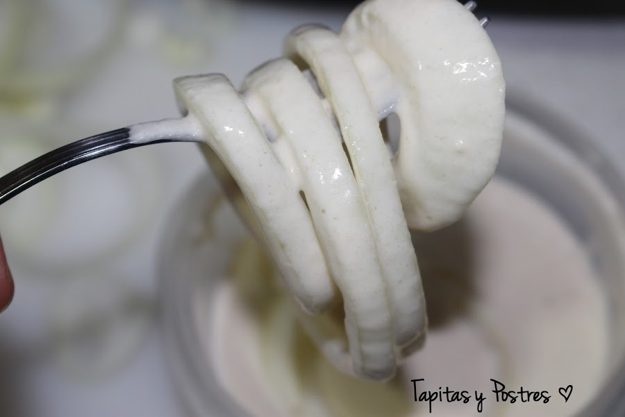 Sumergimos los aros y los escurrimos un poco. Yo lo hice asi, dejándolos escurrir en un tenedor