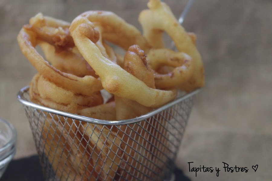 Los aros de cebolla son unos de mis picoteos favoritos. Cuando voy al burguer este famoso que todos conocemos, en lugar de patatas me pido aros de cebolla. Salen tan esponjosos que parecen calamares.