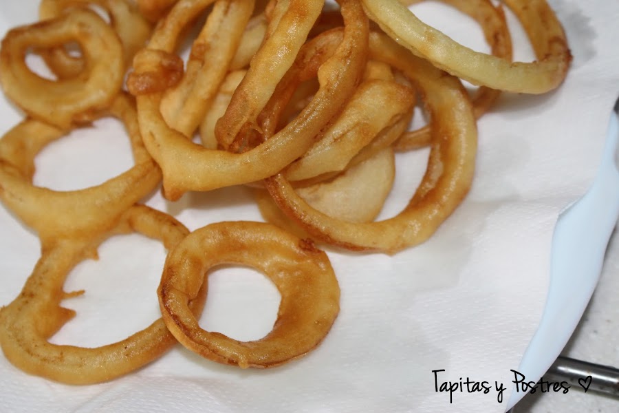 Cortamos la cebolla en aros no muy finos y los bañamos en la masa. Freímos en abundante aceite caliente, mejor en freidora. Al sacarlos dejamos sobre papel absorbente para que escurra el aceite sobrante.