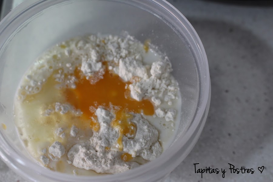 Ponemos la yema, la harina, la sal, el aceite y la leche y mezclamos bien, que no queden grumos.