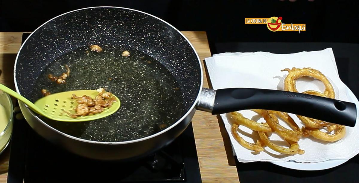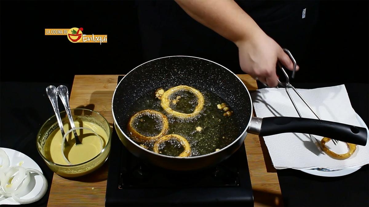 Cuida de retirar los restos de masa que quedan en el aceite, porque si los dejas se van a tostar y darán sabor a quemado al resto de aros de cebolla y al aceite.