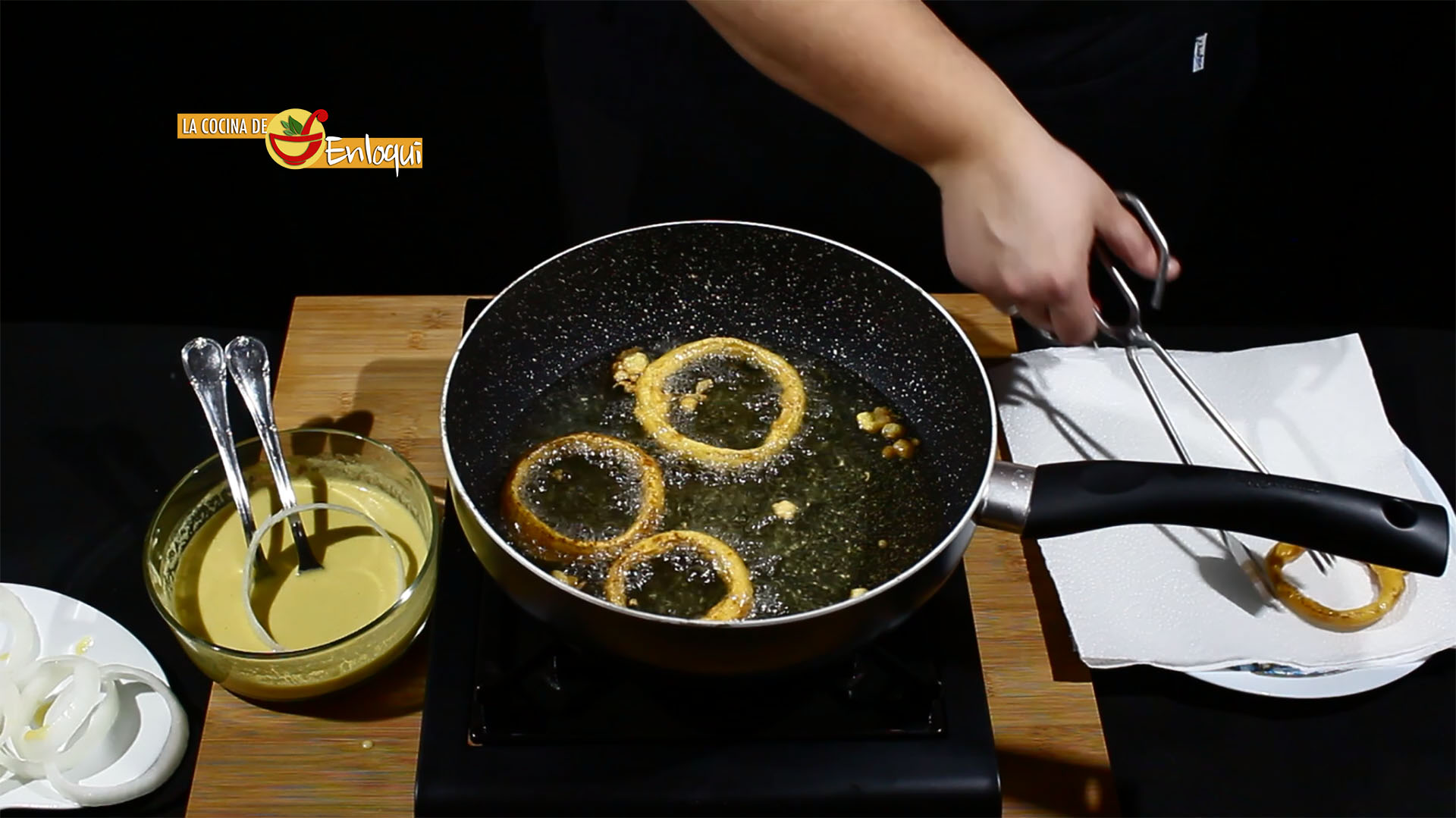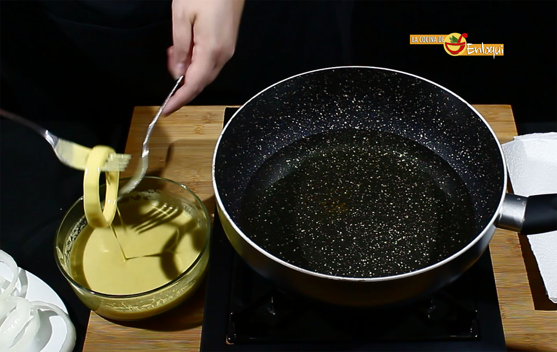 Pon a calentar una sartén con abundante aceite, es importante que esté bien caliente (sin que llegue a humear) para que al freír, el rebozado quede con una capa exterior bien crujiente y en el interior esponjoso y la cebolla bien hecha.